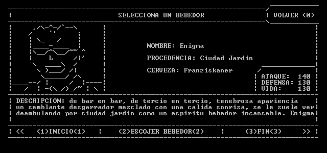Beer Drinker es un juego primitivo, total y absolutamente absurdo y cutre. Creado por la inspiración alcohólica de un otrora principiante de ingeniero con muchisimo tiempo libre. La calidad ascii de sus gráficos te sorprenderá hasta tal punto de dejarte indiferente. El sonido no está registrado, es el speaker de la CPU, no te asustes, es simplemente algo que se dejó de usar hace 20 años.